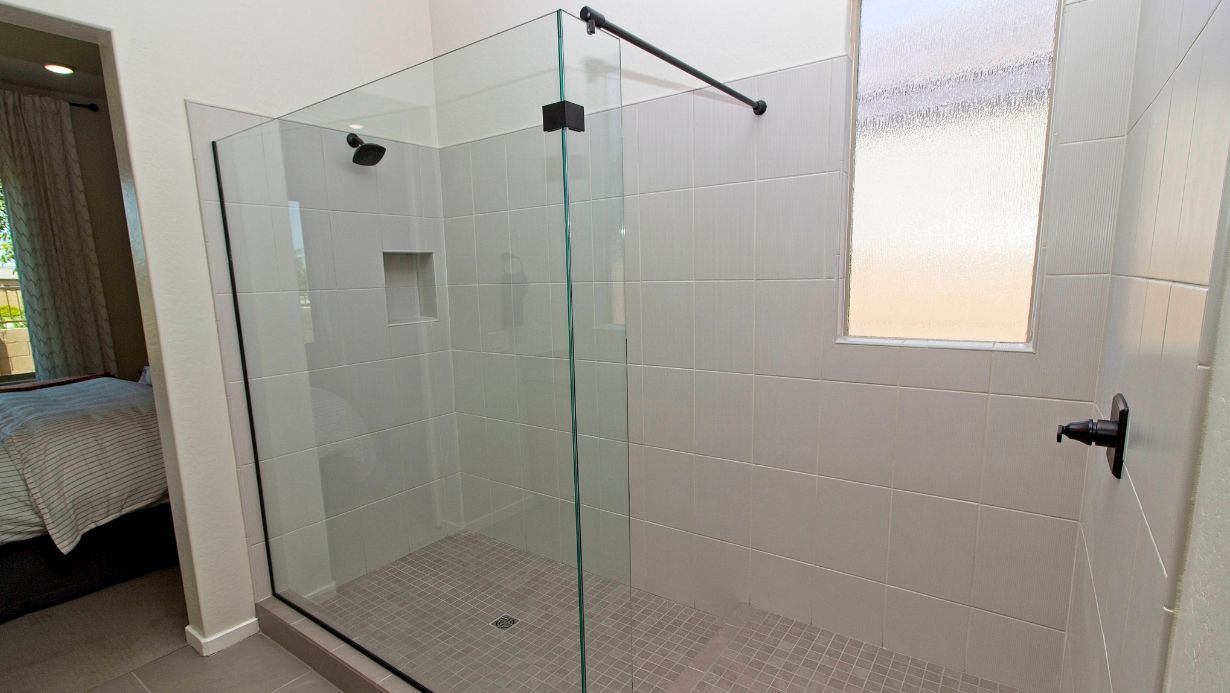 Fixed shower doors feature a single stationary glass panel. The fixed shower glass panel style doesn’t take up much space and creates a clear division between the shower area and the bathroom. This is the most space-savvy style for the bathroom since the shower doors are immovable and don’t require any floor space for operation